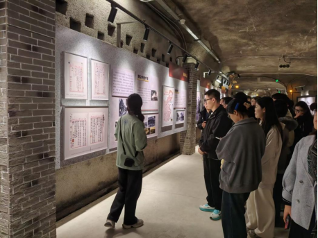 在讲解员的引导下,同学们怀着好奇与敬畏之心走进了这座平时略显“神秘”的地下空间。斑驳的墙壁、狭长的通道,瞬间将大家带回那段战火纷飞的岁月。借助历史文物、图文展板与生动讲述,同学们深入学习了抗战时期重庆大学在防空洞中坚持教学、赓续学脉、救亡图存的感人历史,感受那段自强不息、教育报国的峥嵘历程。